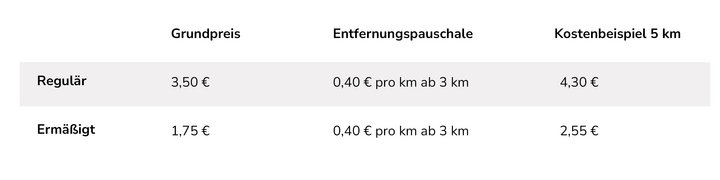Die Kosten setzen sich aus einem Grundpreis und einer Entfernungspauschale pro Kilometer (ab dem dritten Kilometer) zusammen.